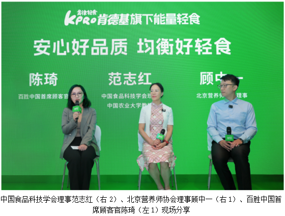 围绕“安心六承诺”,中国食品科技学会理事、中国营养学会食物与烹饪营养分会副主委、中国农业大学教授范志红,北京营养师协会理事顾中一,百胜中国首席顾客官陈琦分别从营养科学的落地、消费者视角的健康升级和KPRO肯律轻食的实践探索等维度展开讨论。